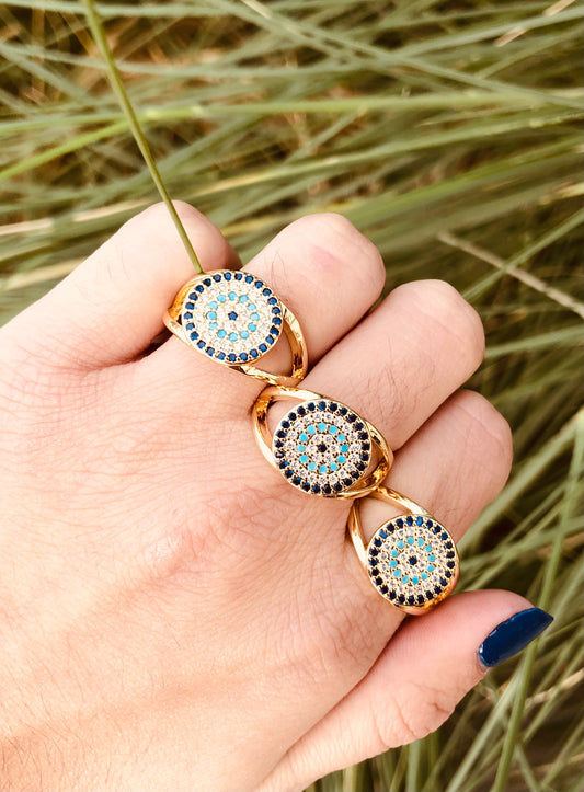 Anillos Ajustables con Diseño de Ojo Turco y Detalles en Zirconias