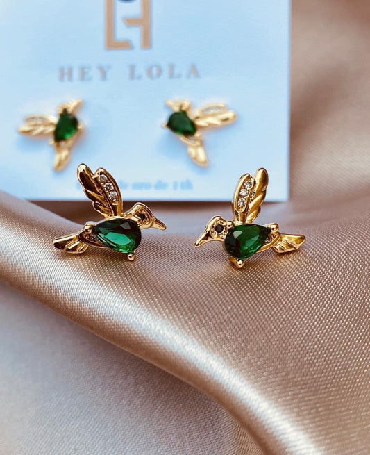 Aretes de Colibrí con Cristales Verdes - Chapados en Oro 14k