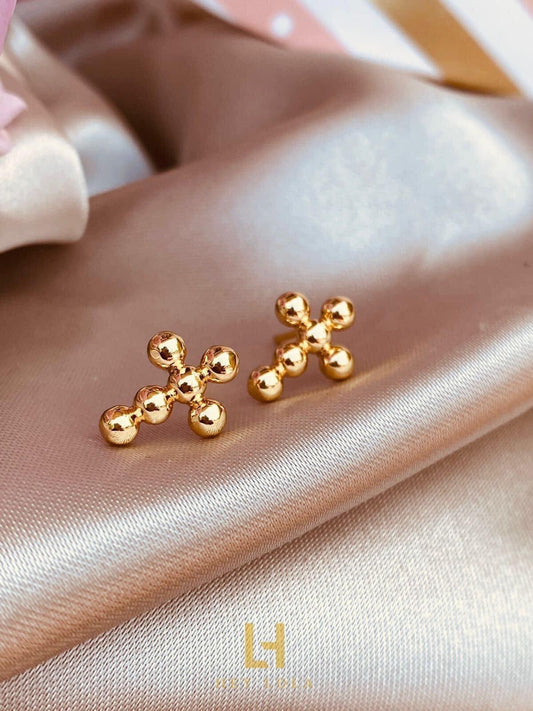 Aretes de Cruz Minimalista con Bolitas Doradas