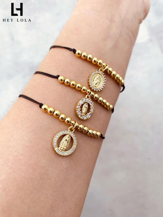Pulsera Virgen de Guadalupe en Chapa de Oro 14K bolas doradas con cordón negro