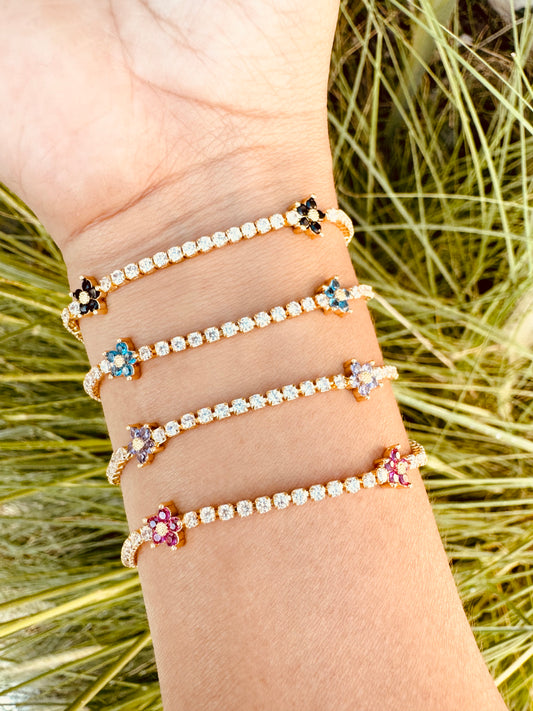 Pulseras Tipo Tennis con Detalle de Flor y Zirconias de Colores