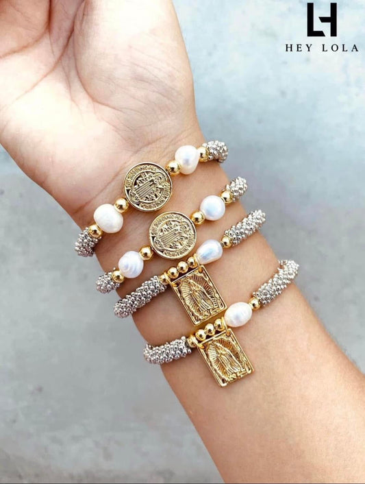 Pulseras Religiosas con Medalla Virgencita y San Benito Perlas Naturales